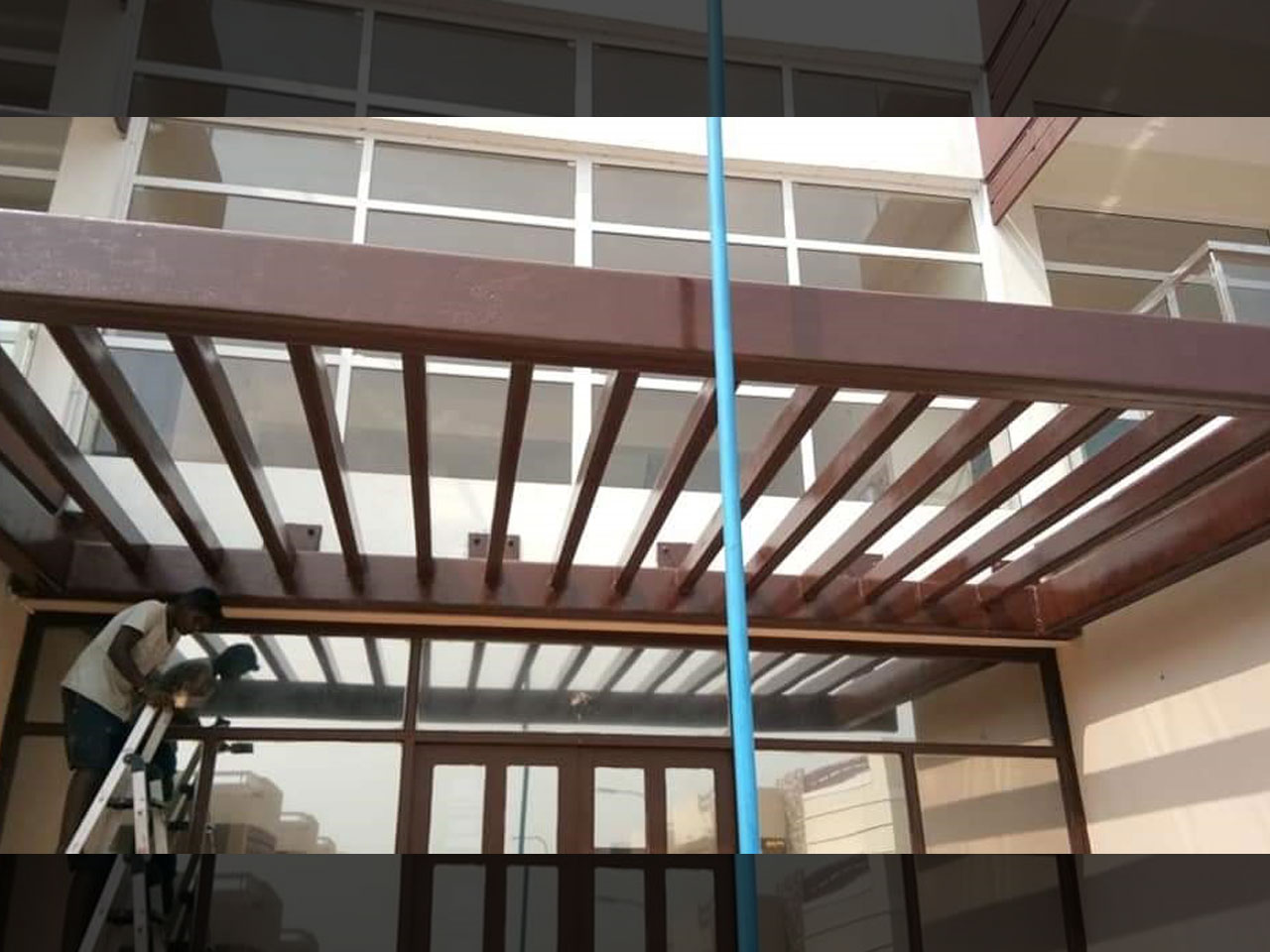 The process of repairing and improving a building so that it is in good condition again or the improvements that are carried out.